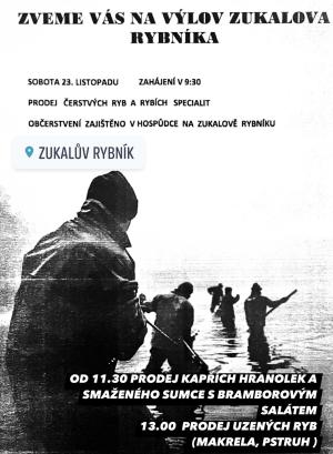 Pan Zukal zve všechny občany v sobotu 23. listopadu od 9:30 hodin na výlov Zukalova Rybníka. Po slovení rybníka bude možnost si zakoupit živou rybu a ochutnat kapří hranolky, nebo smaženého sumce a další. Nebude chybět svařáček, nebo horká medovina.