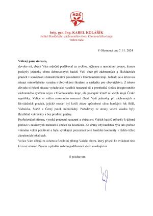 Poděkování za nasazení jednotky sboru dobrovolných hasičů - Povodně Jesenicko 2024