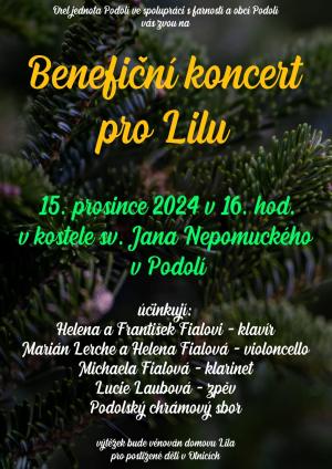 Orel jednota Podolí ve spolupráci s farností a obcí Podolí Vás srdečně zvou na BENEFIČNÍ KONCERT PRO LILU 15. prosince 2024 v 16 hodin v kostele sv. Jana Nepomuckého v Podolí.