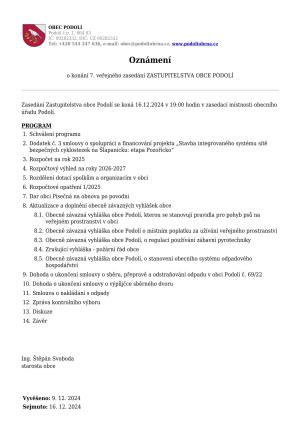 Zasedání zastupitelstva 16.12.2024 od 19:00.