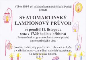 Výbor SRPŠ při základní a mateřské škole Podolí zve všechny v pondělí 11. listopadu od 17:30 hodin na SVATOMARTINSKÝ LAMPIONOVÝ PRŮVOD.