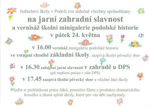 Ředitelství školy v Podolí zve srdečně všechny spoluobčany na jarní zahradní slavnost a vernisáž školní minigalerie podolské historie v pátek 24. května