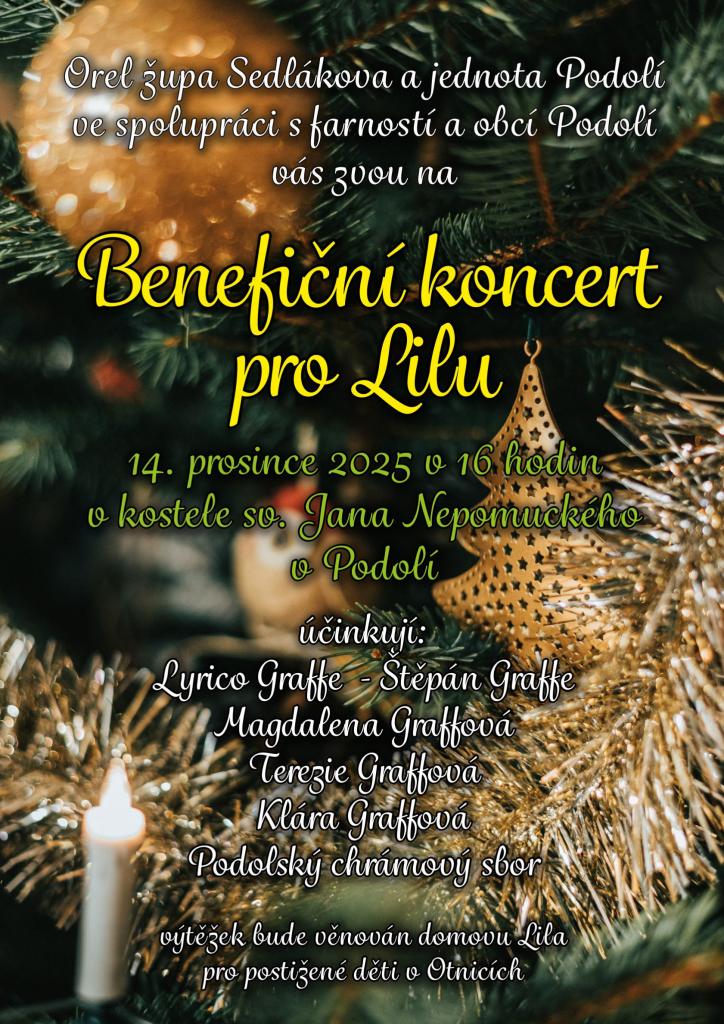 Orel jednota Podolí ve spolupráci s farností a obcí Podolí Vás srdečně zvou na BENEFIČNÍ KONCERT PRO LILU