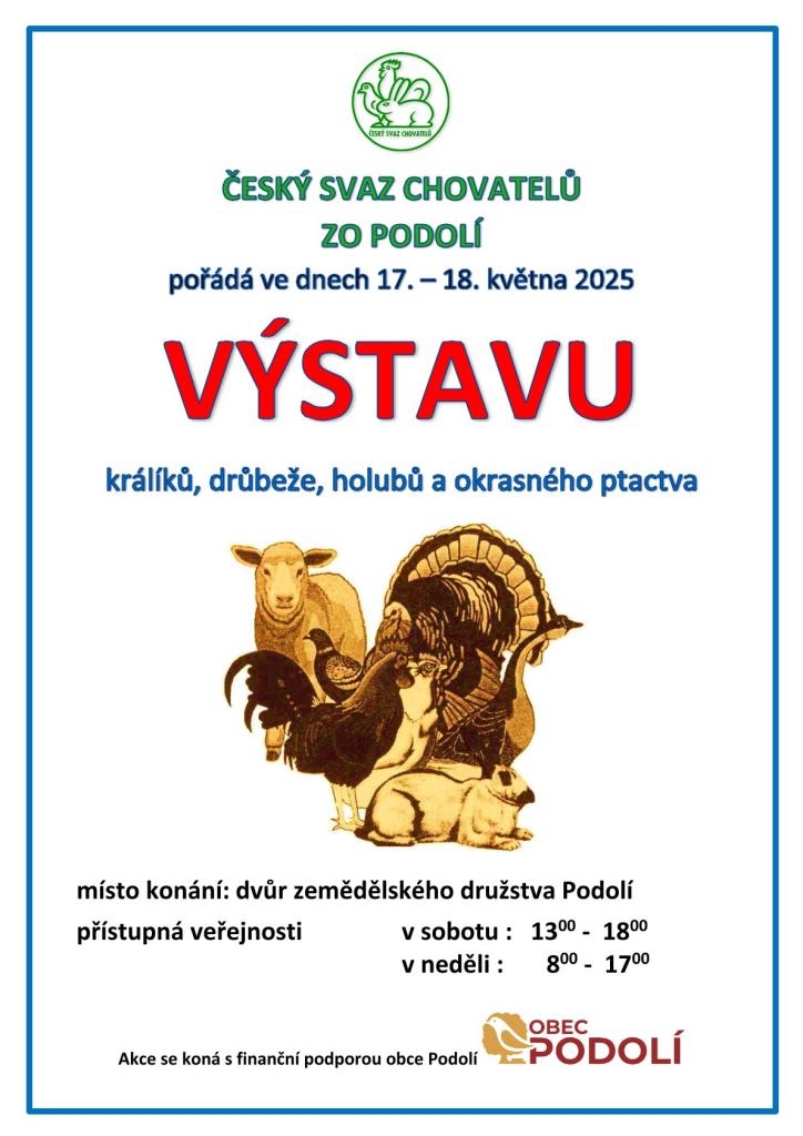 Český svaz chovatelů, ZO Podolí, vás srdečně zve na tradiční výstavu králíků, drůbeže, holubů a okrasného ptactva.