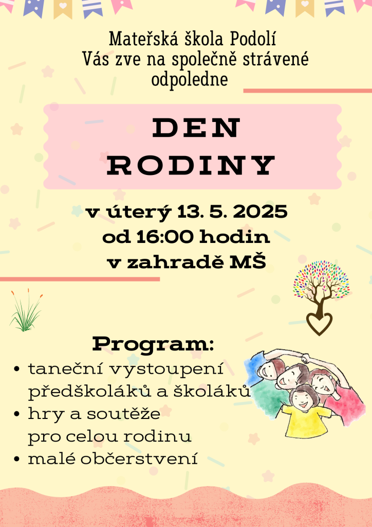 Mateřská škola Podolí srdečně zve všechny děti, rodiče i prarodiče na Den rodiny, který se uskuteční v úterý 13. května 2025 od 16:00 hodin v zahradě mateřské školy.