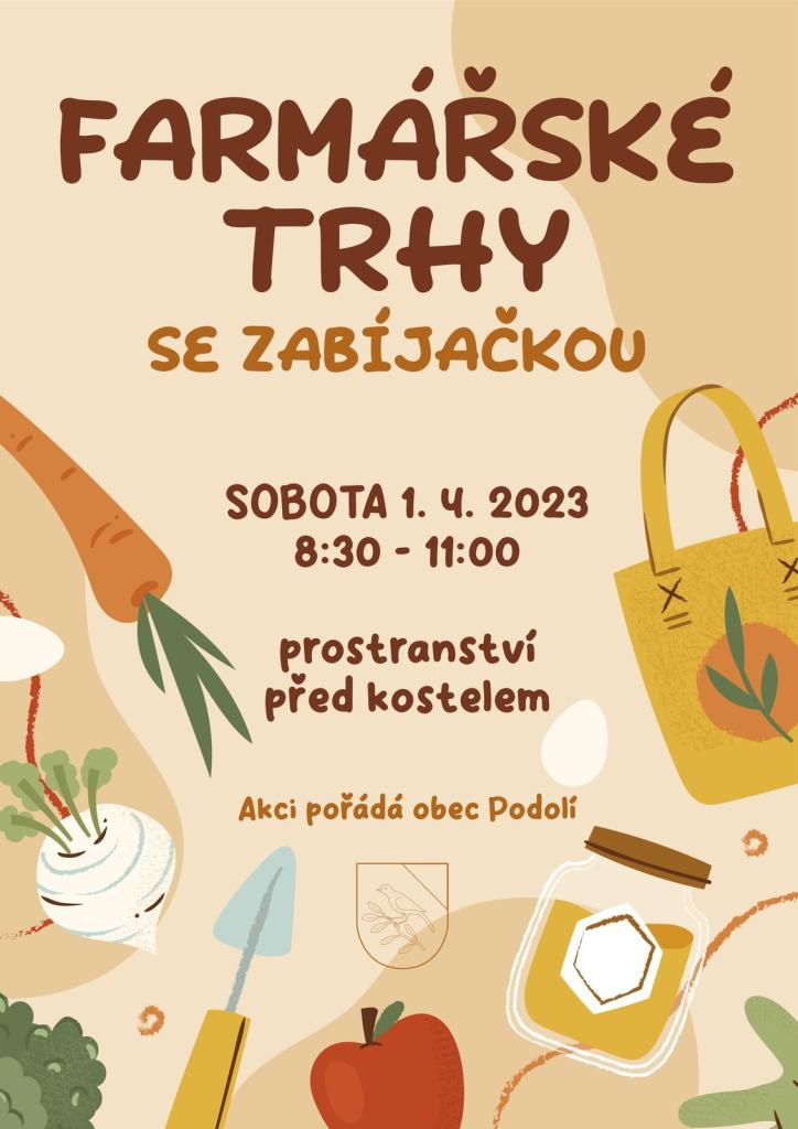 Obec Podolí vás zve na FARMÁŘSKÉ TRHY SE ZABÍJAČKOU, které se konají 1. dubna od 8:30 do 11:00 na prostranství před kostelem v Podolí.
