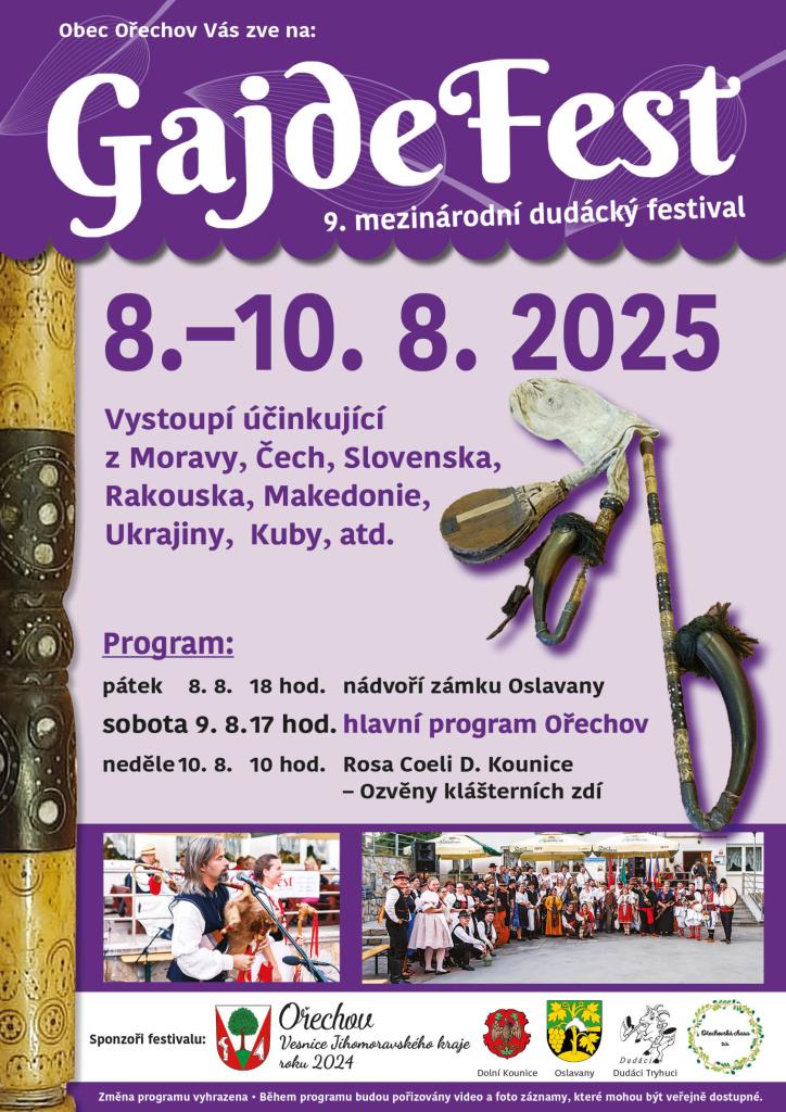Obec Ořechov srdečně zve na 9. ročník mezinárodního dudáckého festivalu GajdeFest, který se uskuteční ve dnech 8.–10. srpna 2025.
