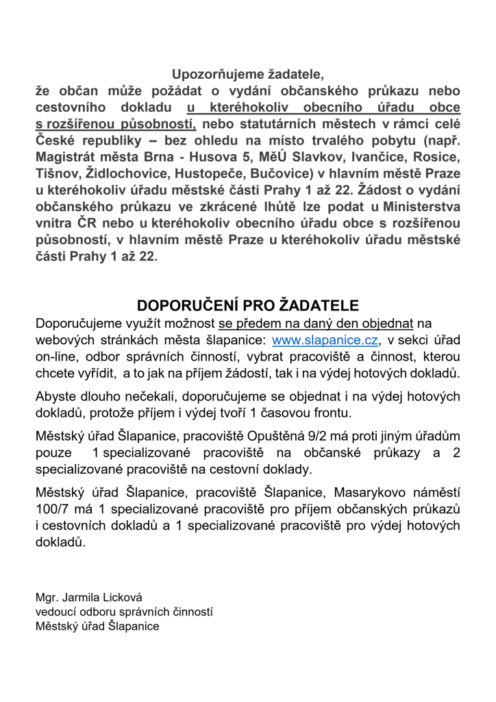 Informace k vydávání osobních dokladů z MěÚ Šlapanice 1
