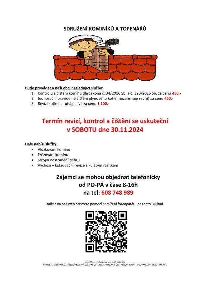 Bude provádět v naší obci v SOBOTU dne 30.11. požadované kontroly a čištění komínů dle zákonu č. 34/2016 Sb. za 450 Kč, čištění plynových kotlů za 450 Kč a revize kotlů na tuhá paliva za 1 100 Kč. Dále nabízí vložkování a frézování komínů.