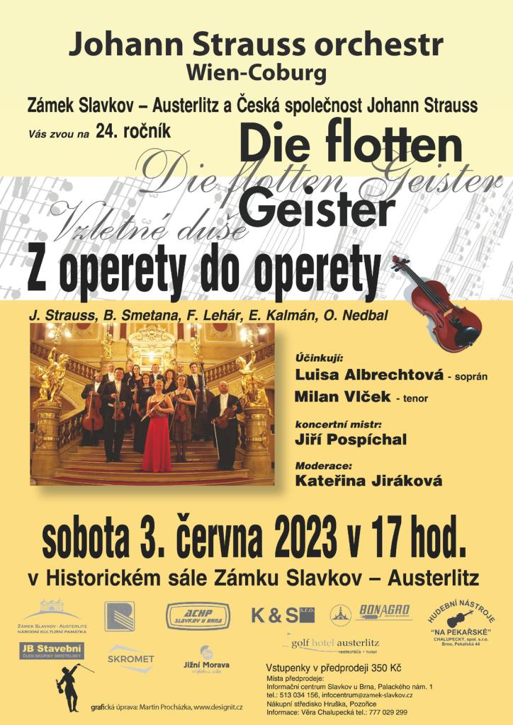 Zámek Slavkov - Austerlitz a Česká společnost Johann Strauss Vás zvou na 24. ročník koncertu Johann Strauss orchestru „Z operety do operety“ který se bude konat 3.6.2023 v 17 hodin v Historickém sále zámku.
