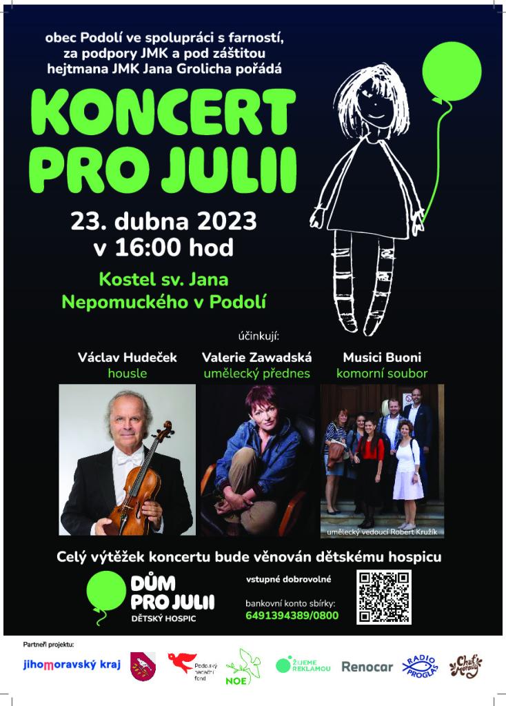 Obec Podolí ve spolupráci s farností, za podpory JMK a pod záštitou hejtmana JMK Jana Grolicha pořádá 23. dubna 2023 v 16 hodin v kostele sv. Jana Nepomuckého v Podolí KONCERT PRO JULII.