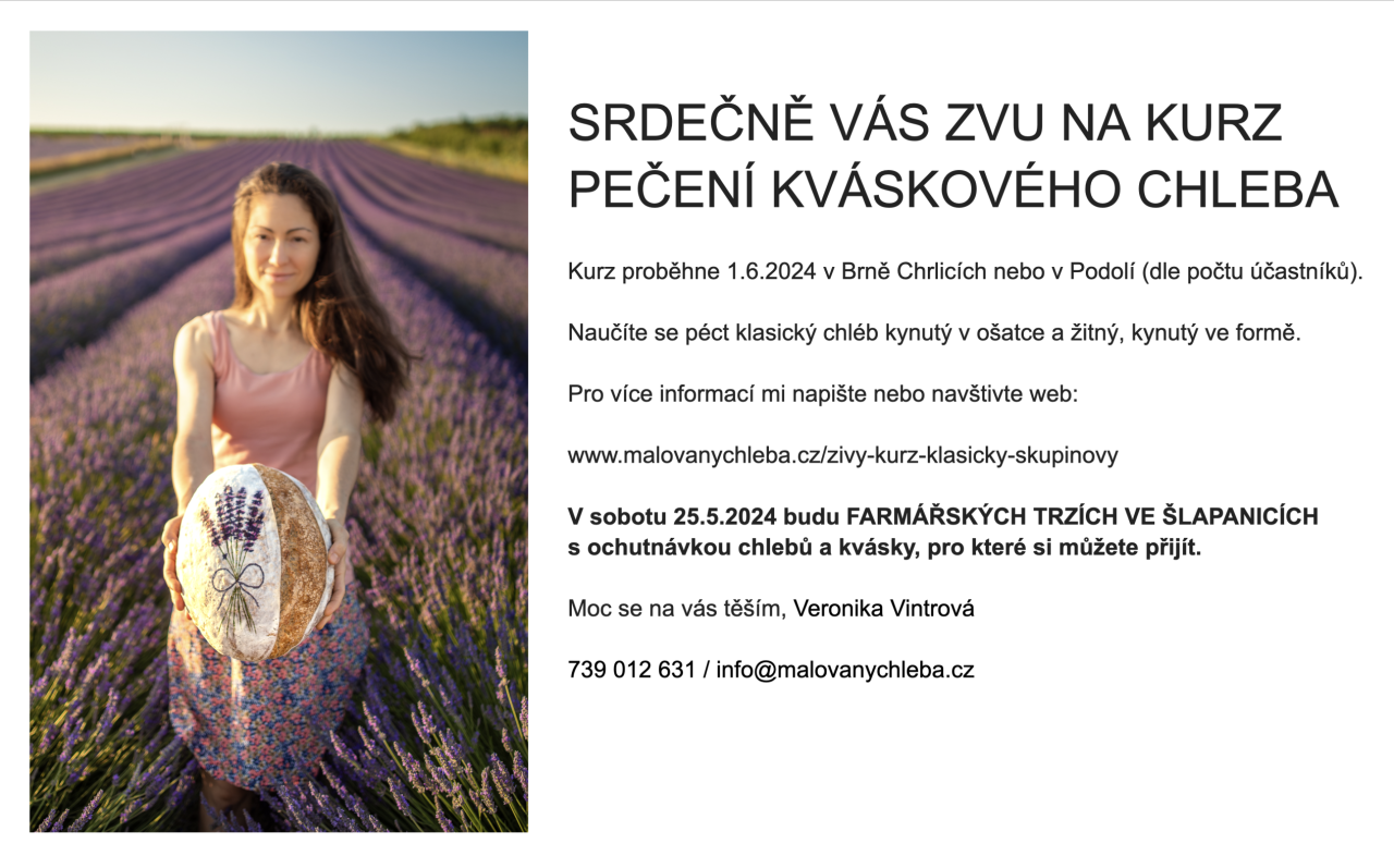 V sobotu 25.5.2024 budu na FARMÁŘSKÝCH TRZÍCH VE ŠLAPANICÍCH s ochutnávkou chlebů a kvásky, pro které si můžete přijít.