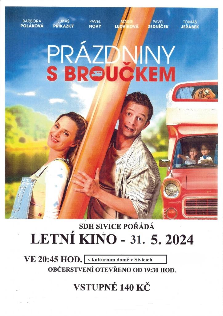SDH Sivice Vás zve v pátek 31.5. 2024 ve 20:45 hodin na letní kino. Promítat se bude z důvodu špatného počasí v kulturním domě v Sivicích.