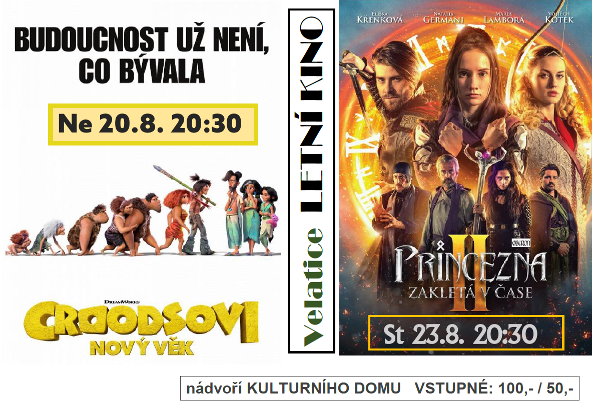 Letní kino Velatice - na nádvoří kulturního domu ve Velaticích. V neděli 20.8. ve 20:30 a ve středu 23.8. ve 20:30. Podrobnosti na .