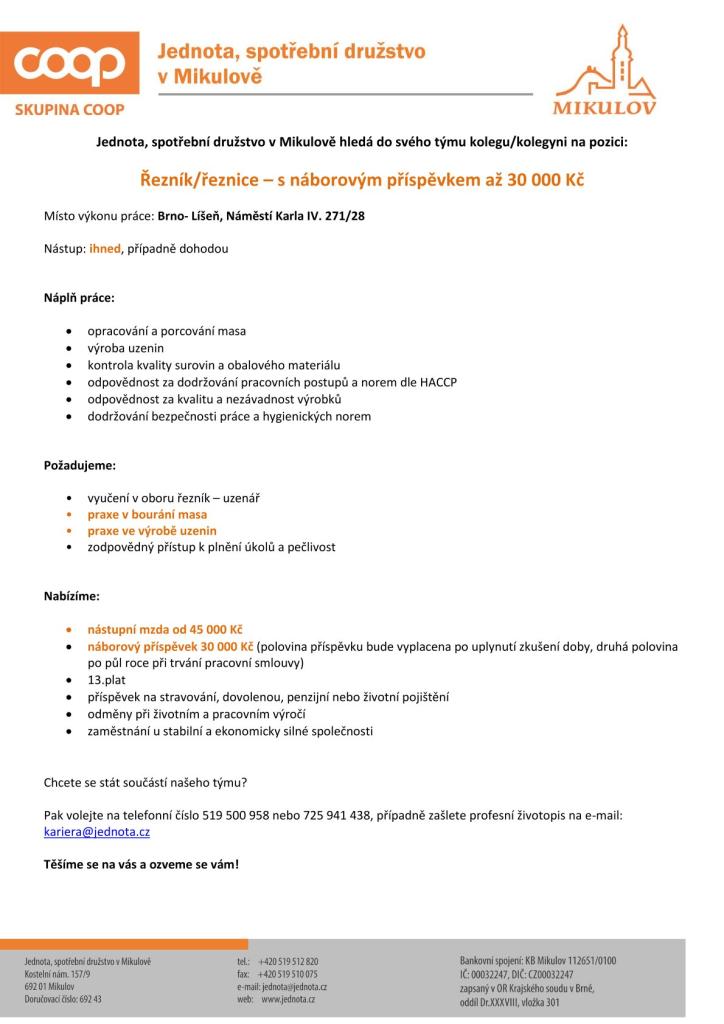 „Jednota, spotřební družstvo v Mikulově hledá zaměstnance do výrobny masa a uzenin Brno- Líšeň, Náměstí Karla IV, na pozici řezník/řeznice s nástupní mzdou od 45 000 Kč a náborovým příspěvkem 30 000 Kč.