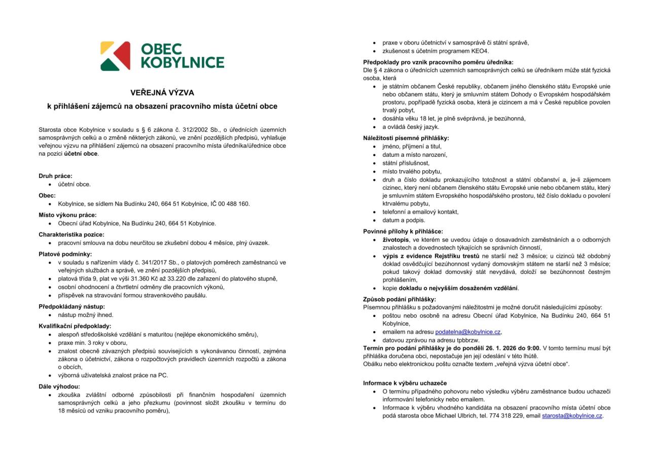 Starosta obce Kobylnice vyhlašuje veřejnou výzvu k podání přihlášek na pracovní místo úředníka/úřednice – účetní obce.