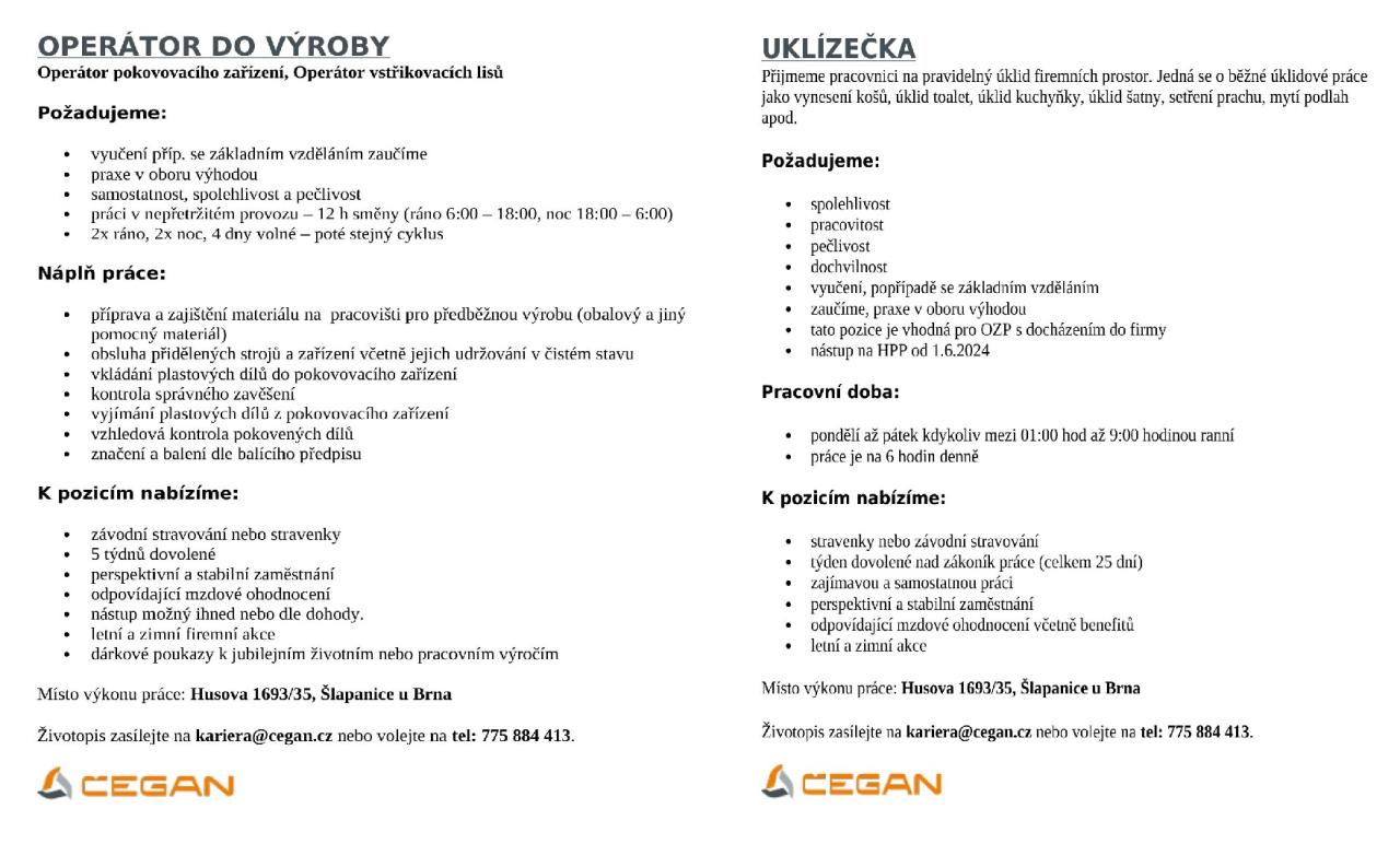 Společnost ČEGAN s.r.o. hledá zaměstnance na obsazení těchto pracovních pozic:
