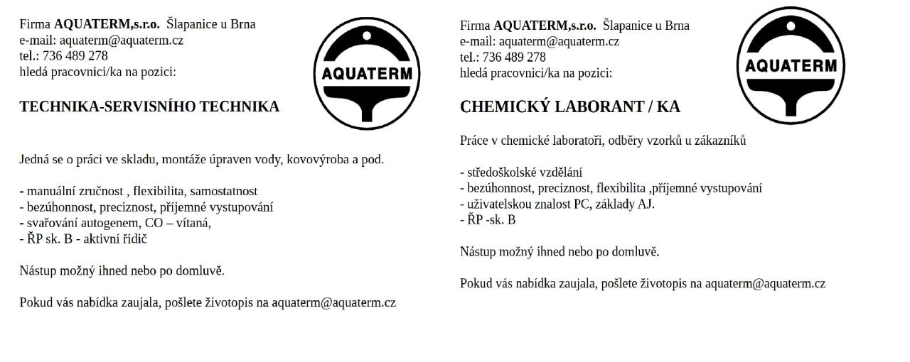 Firma AQUATERM,s.r.o. ze Šlapanic hledá zaměstnance na obsazení těchto pracovních pozic: