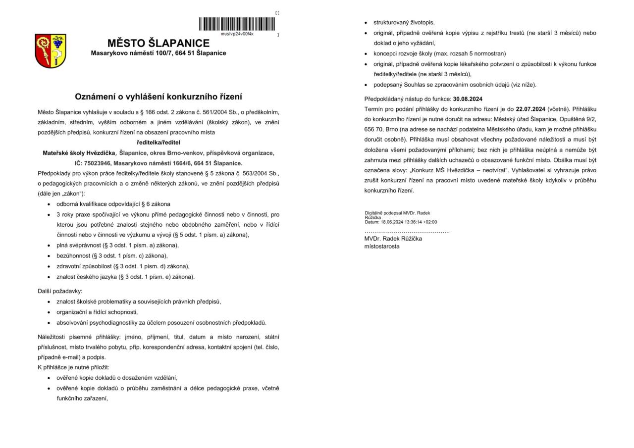 Město Šlapanice vyhlásilo konkurzní řízení na obsazení pracovního místa ředitelka/ředitel Mateřské školy Hvězdička, Šlapanice, kdy předpokládaný nástup do funkce je 30.08.2024 a termín pro podání přihlášky do konkurzního řízení je do 22.07.2024 (včetně).