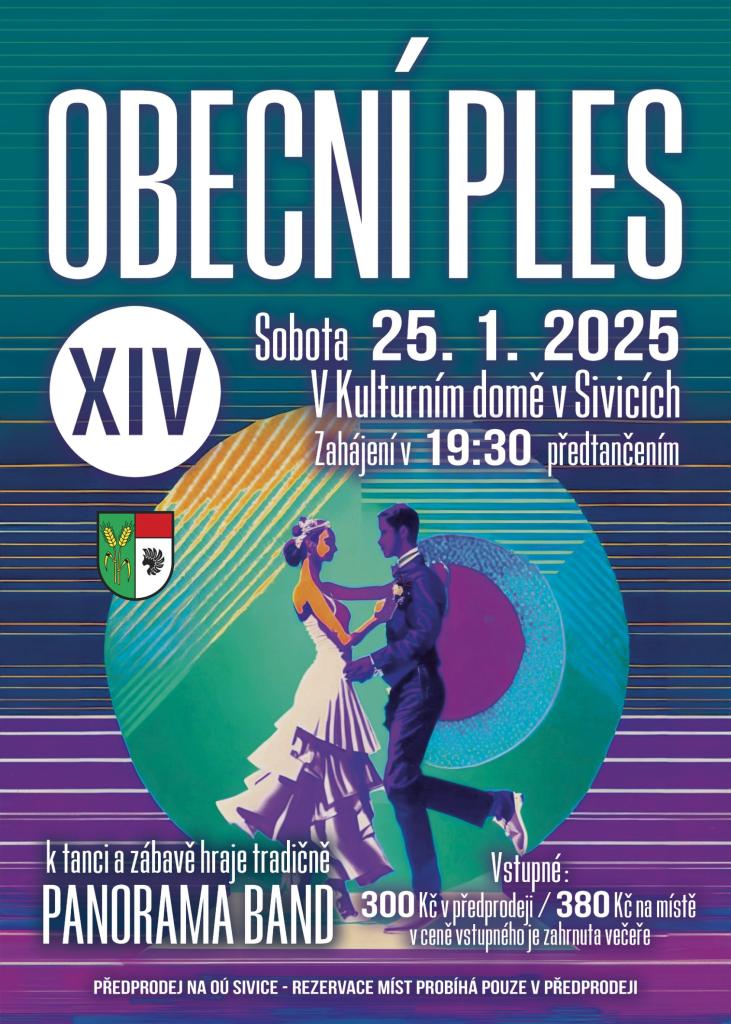 Obec Sivice vás srdečně zve na XIV. obecní ples, který se koná 25. 1. 2025 v Kulturním domě v Sivicích od 19:30 hodin. K tanci a zábavě hraje skupina Panorama Band.