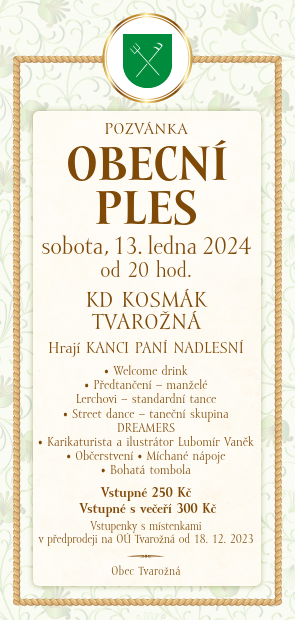 V sobotu 13. ledna 2024 od 20 hod. se v KD Kosmák Tvarožná koná obecní ples. Více informací na plakátu.