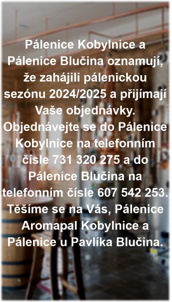 Pálenice Kobylnice a Pálenice Blučina oznamují, že zahájili pálenickou sezónu 2024/2025 a přijímají Vaše objednávky. Objednávejte se do Pálenice Kobylnice na telefonním čísle 731 320 275 a do Pálenice Blučina na telefonním čísle 607 54 22 53. Těšíme se na Vás, Pálenice Aromapal Kobylnice a Pálenice u Pavlíka Blučina.