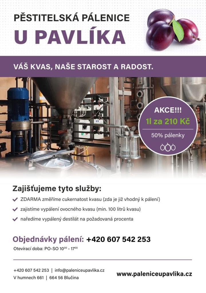 Pálenice Kobylnice a Pálenice Blučina zahajují pálení od 1.8. a již nyní přijímají Vaše objednávky. Objednávejte se do Pálenice Kobylnice na telefonním čísle 731 320 275 a do Pálenice Blučina na telefonním čísle 607 54 22 53. Cena destilátu je 210,- Kč/ 1l 50% alkoholu. Těšíme se na Vás Pálenice Aromapal Kobylnice a Pálenice u Pavlíka Blučina.