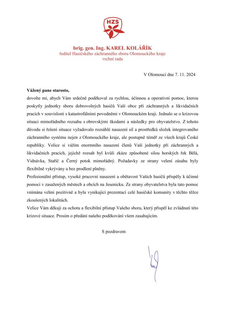 Olomoucký hasičský záchranný sbor děkuje naší jednotce sboru dobrovolných hasičů obce Podolí za rychlou pomoc při zvládání následků způsobené katastrofálními povodněmi v Olomouckém kraji.