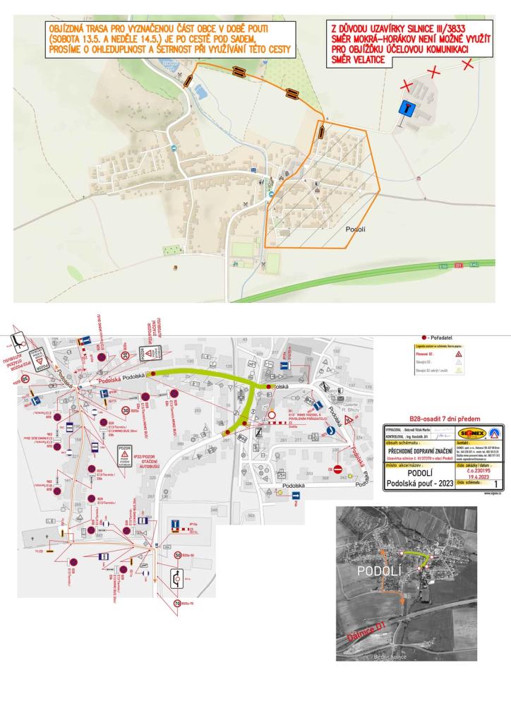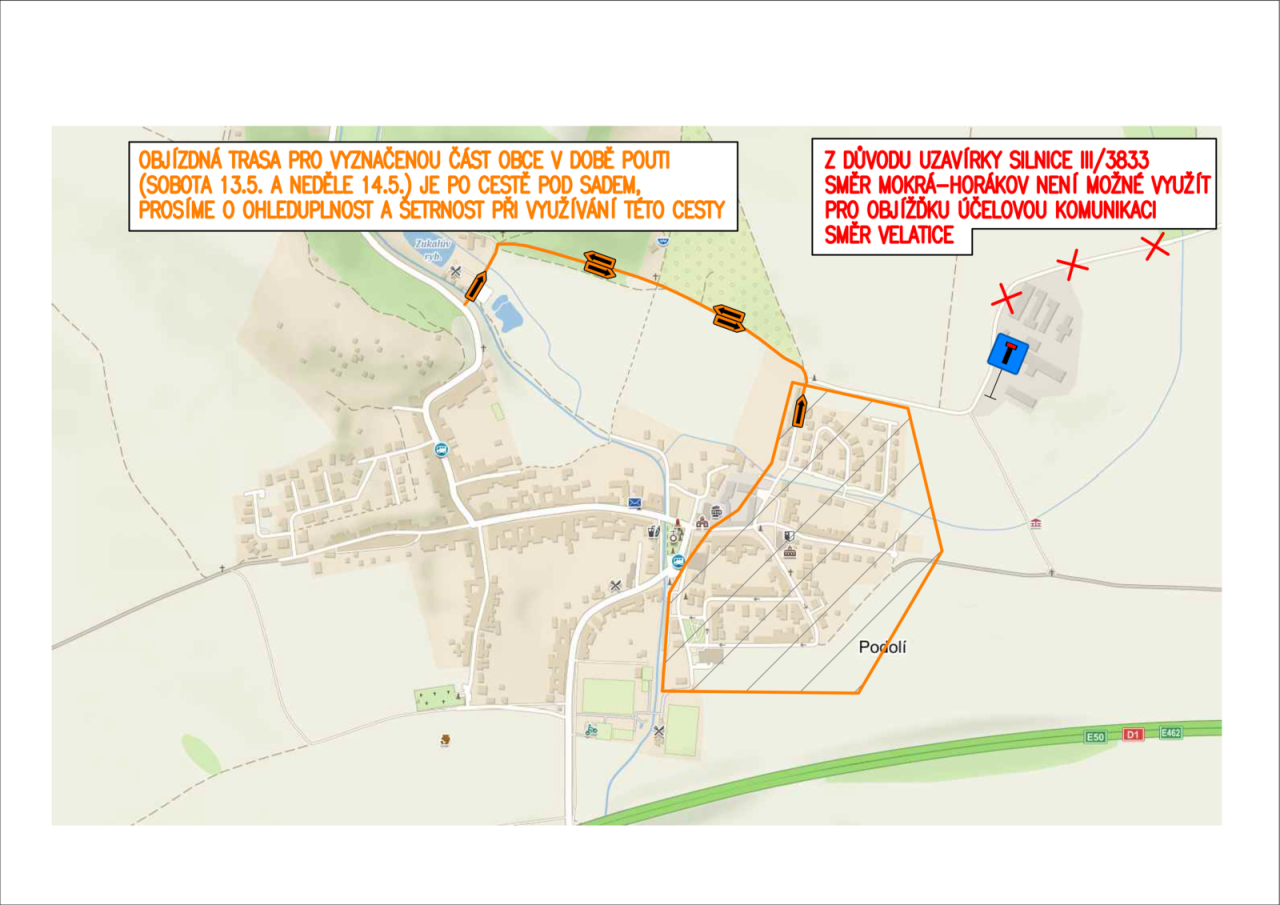 2. Ulice Valcha, Na Stání, U Sokolovny, Kolonka, Za Zámkem, Za Farou, Nová, Nad OÚ a Za Zdravotním střediskem musí ve dnech 10.-12.5. projíždět přes uzavírku na ulici Dědina nebo Rybník a ve dnech pouti 13.-14.5. přes objízdnou trasu po cestě pod sadem (). Bohužel vzhledem k omezení provozu na silnici III/3833 není možné využít objízdnou trasu po účelové komunikaci kolem Agropodu směrem na Velatice, proto je jediná další možnost cesta pod sadem od Zukalova mlýna. Prosíme všechny, kteří budou muset využít cestu pod sadem o ohleduplnost a šetrnost nejen k cestě. Při projíždění v uzávěře dbejte zvýšené opatrnosti.