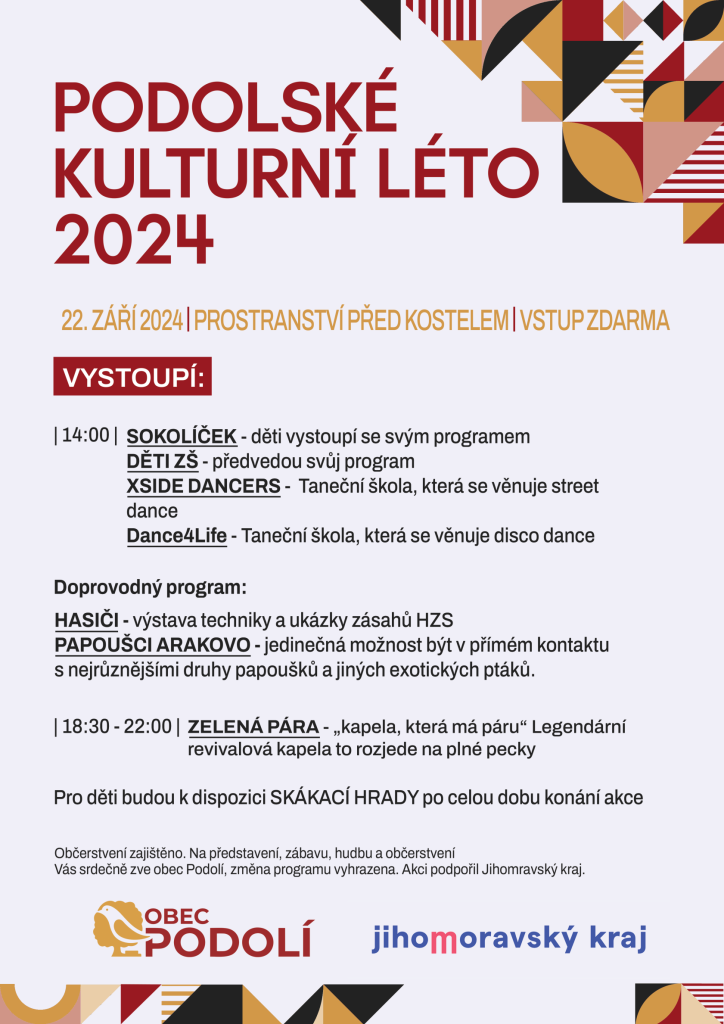 Obec Podolí Vás zve na akci PODOLSKÉ KULTURNÍ LÉTO 2024, které se koná 22. září na prostranství před kostelem.