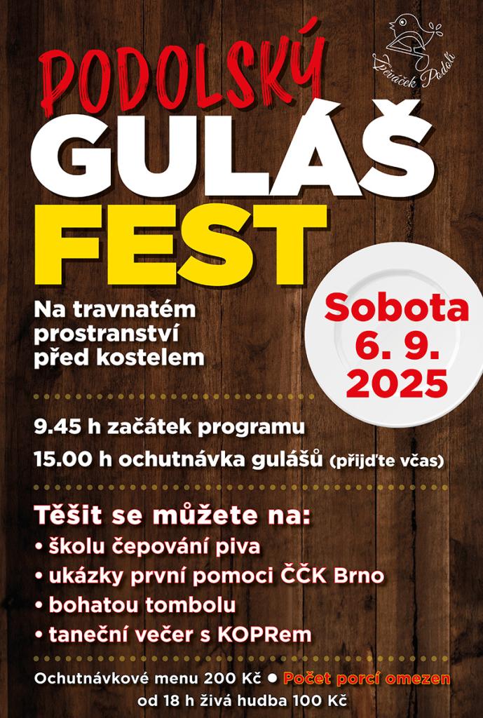 Spolek Zpěváček Podolí vás srdečně zve na Gulášfest, který se uskuteční v sobotu 6. 9. 2025 na travnatém prostranství před kostelem v Podolí.
