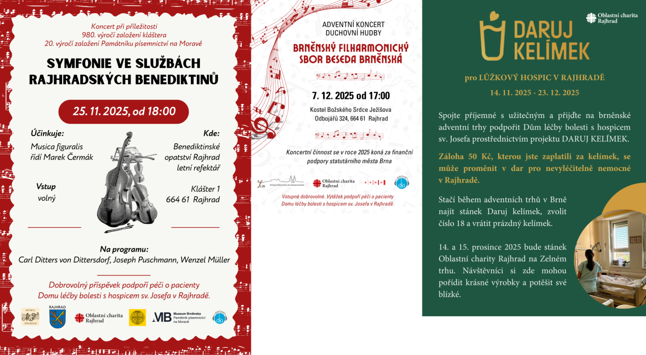 Dne 5. prosince 2025 se v Kostele Božského Srdce Ježíšova v Rajhradě představí Brněnský filharmonický sbor Beseda brněnská. Koncert je pořádán na podporu hospice sv. Josefa.