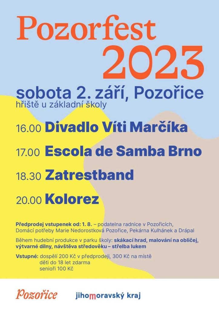 V sobotu 2. září se v Pozořicích koná na hřišti základní školy Pozorfest 2023. Předprodej vstupenek bude zahájen 1.8. Více informací na .
