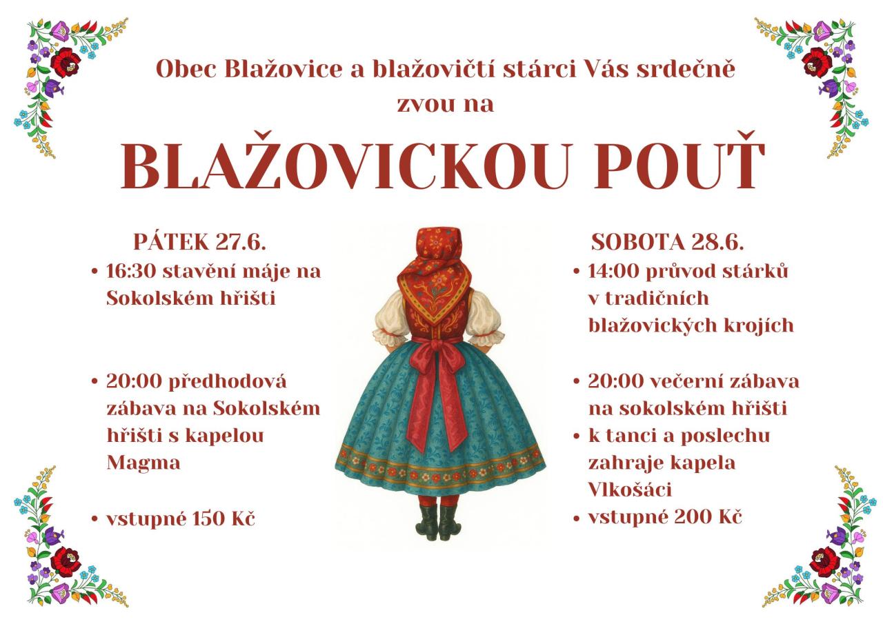 Obec Blažovice si vás dovoluje srdečně pozvat na tradiční Blažovickou pouť, která se uskuteční o víkendu 27.–28. června 2025.