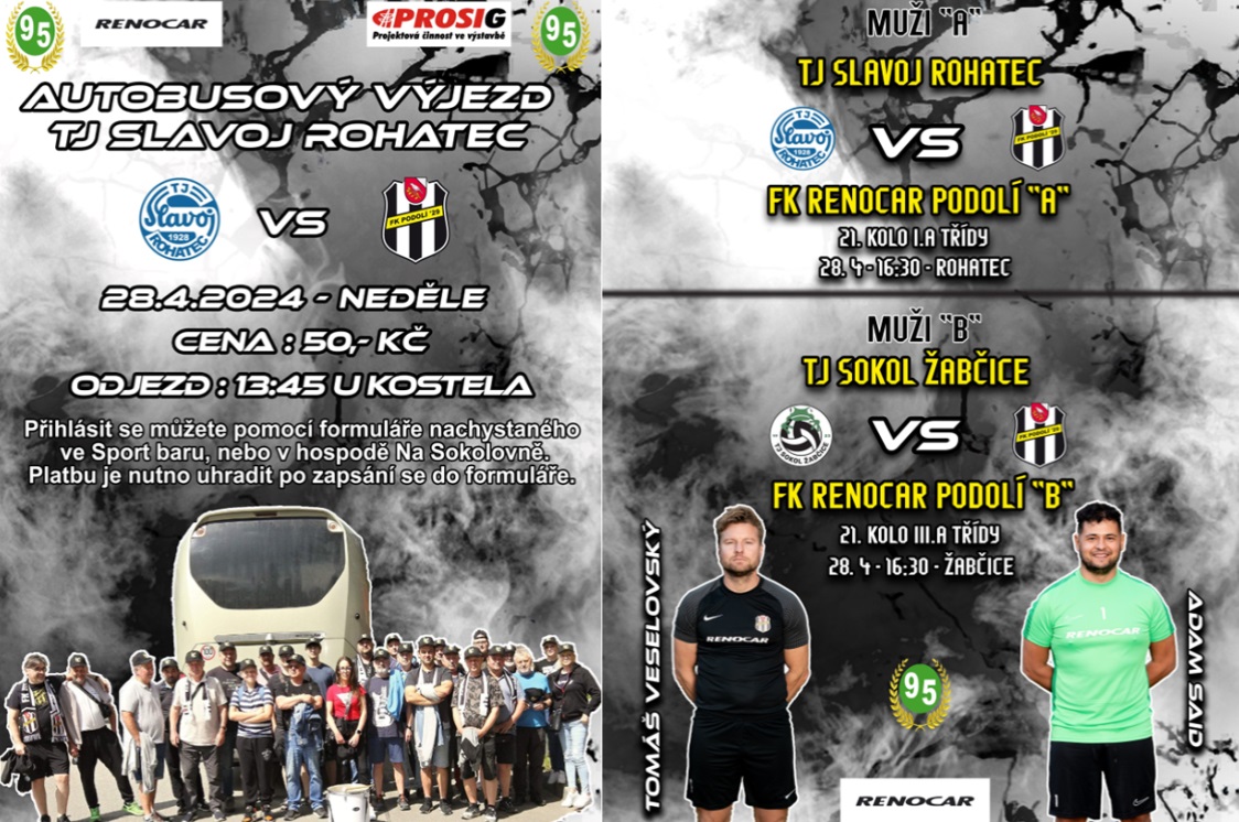 „FK RENOCAR PODOLÍ zve všechny občany, nejen fanoušky fotbalu, na tento fotbalový víkend s výjezdem autobusem do Rohatce a vložený středeční zápas 1.5. našich MUŽŮ A.