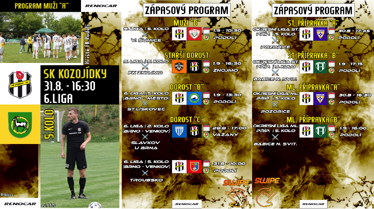 „FK RENOCAR PODOLÍ zve všechny občany, nejen fanoušky fotbalu, na tento fotbalový víkend, kdy se odehraje celkem OSM domácích utkání našich mužstev.