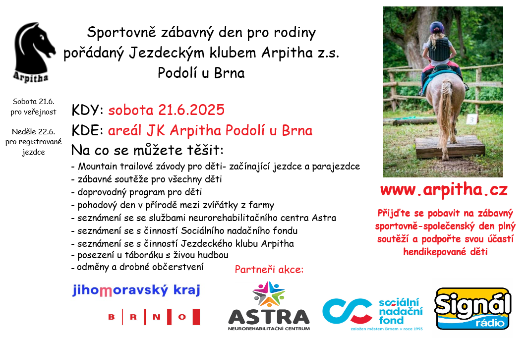 srdečně vás zveme na sportovně-zábavný den, který se uskuteční v sobotu 21. června 2025 v areálu Jezdeckého klubu Arpitha v Podolí.