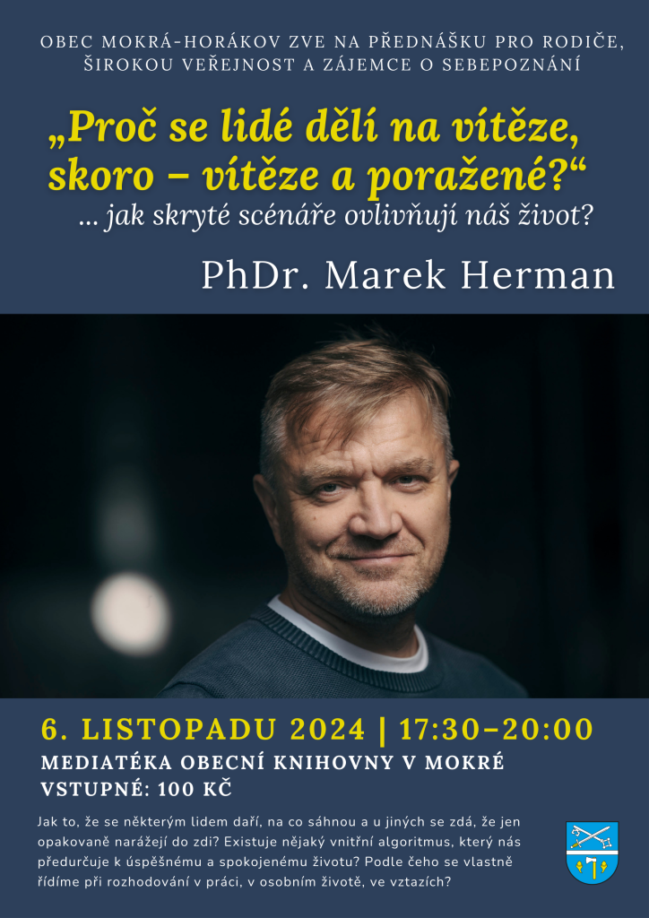 Obec Mokrá Horákov zve 6. listopadu 2024 od 17:30 hodin na přednášku pro rodiče, širokou veřejnost a zájemce o sebepoznání.