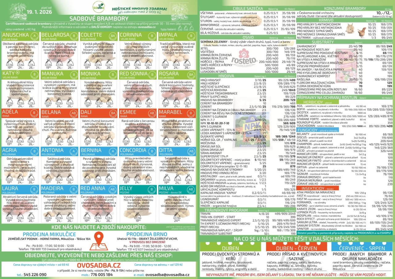 „Firma OVO-SADBA Brno zahájila prodej sadbových brambor, hnojiv, substrátů a dalších potřeb pro zahrádkáře. V nabídce naleznete také zeleninová semínka, cibuli sazečku, postřiky a mnoho dalšího – vše za výhodné ceny. Reklamní leták již naleznete od minulého týdne ve svých poštovních schránkách.