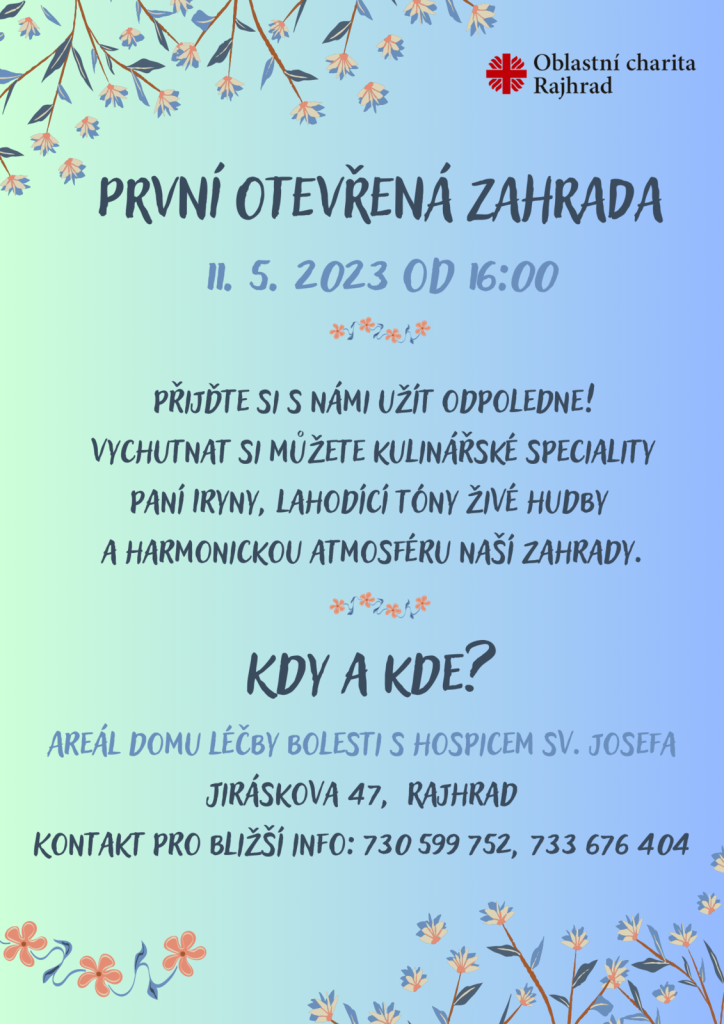 Oblastní charita Rajhrad vás zve na letošní první Otevřenou zahradu která se bude konat 11.5. 2023 od 16:00 v areálu Oblastní charity v Rajhradě.