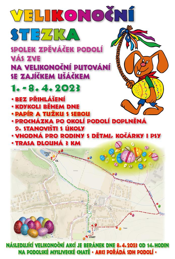Spolek Zpěváček Podolí Vás zveme na Velikonoční stezku aneb Putování se zajíčkem Ušáčkem v okolí obce Podolí u Brna. Tentokrát Vás čeká devět stanovišť. Stezka je vhodná pro rodiny s dětmi, kočárky i pejsky. Trasa je dlouhá cca 3 km. Těšíme se na Vás.