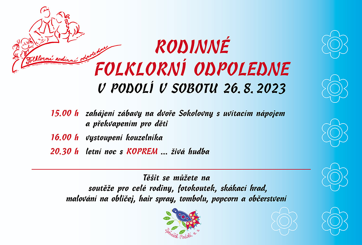 Zveme všechny občany Podolí na Rodinné folklorní odpoledne, které se bude konat 26.8.2023 na dvoře Sokolovny.