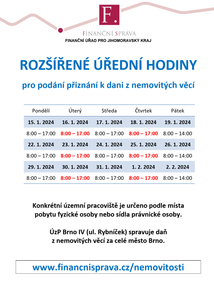Finanční úřad pro Jihomoravský kraj informuje o rozšířených úředních hodinách.