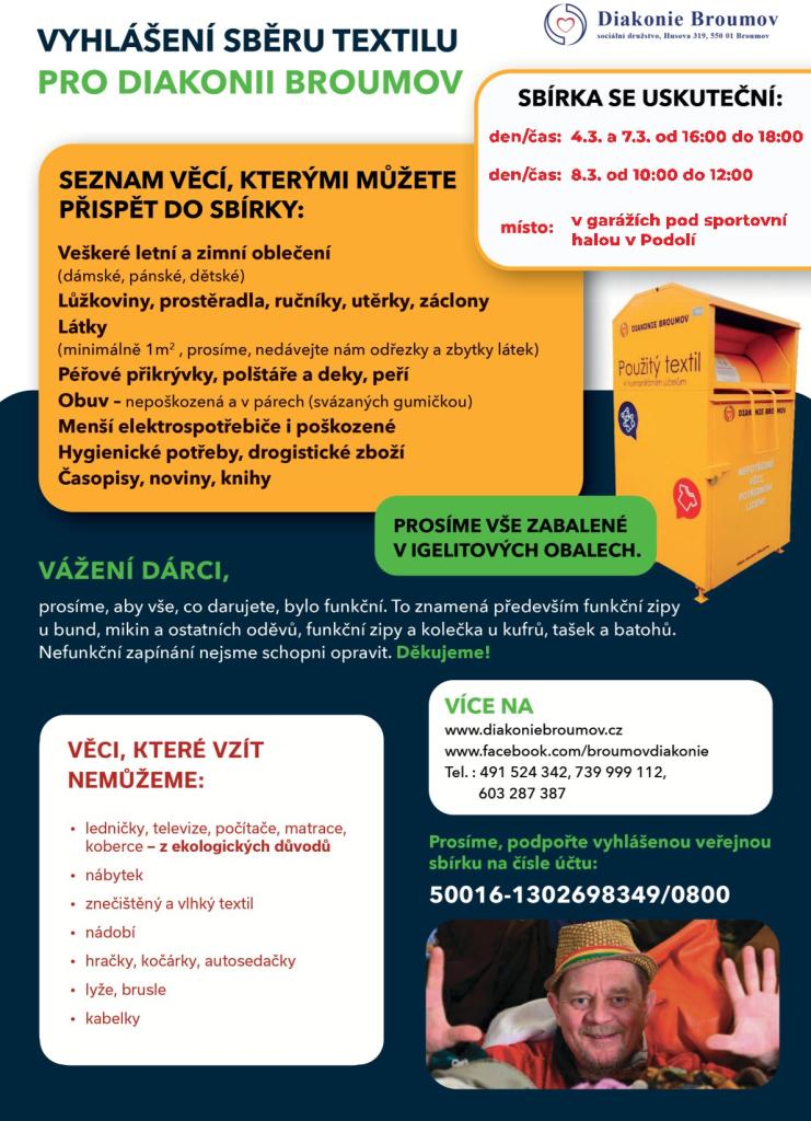 Vážení občané, Diakonie Broumov pořádá opět sbírku oblečení, lůžkovin, obuvi, domácích potřeb a dalších věcí.