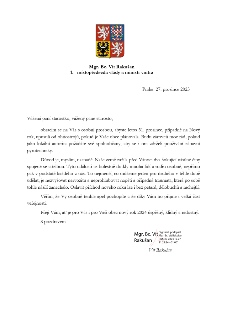 S touto prosbou se ministr vnitra Vít Rakušan obrátil dopisem na všechny starostky a starosty obcí. V souvislosti s vražednými útoky, které se staly před letošními Vánocemi, požádal Vít Rakušan představitele obcí, aby upustili od plánovaných ohňostrojů. Zároveň je poprosil, aby apelovali i na své spoluobčany, aby se i oni zdrželi používání zábavní pyrotechniky.