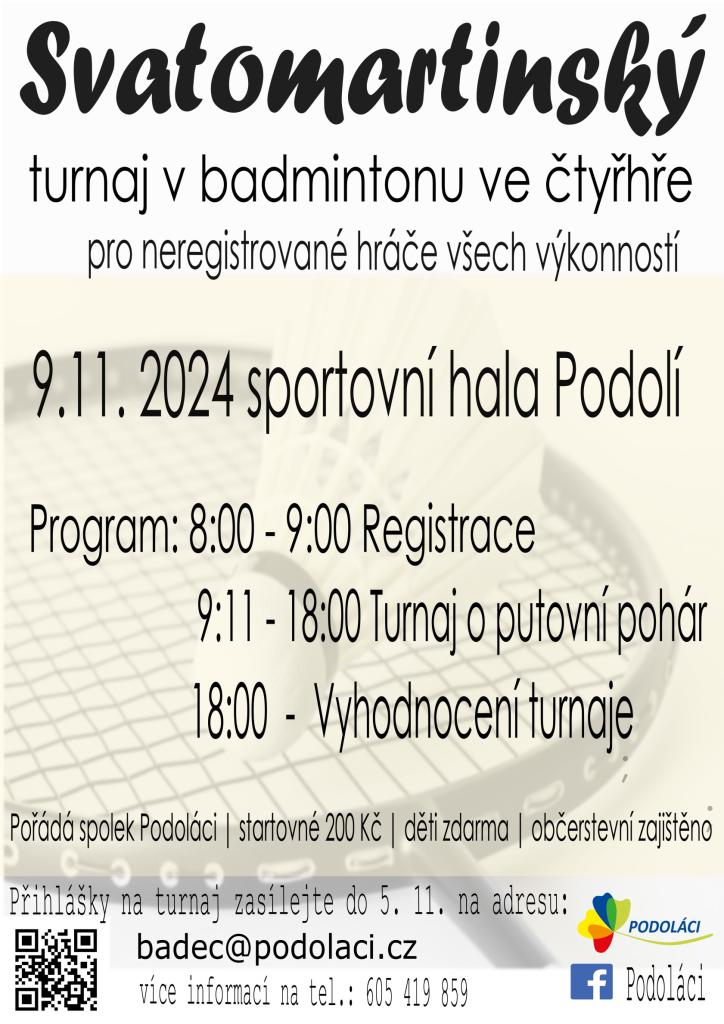 Spolek Podoláci zve všechny na Svatomartinský turnaj v badmintonu ve čtyřhře pro neregistrované hráče všech výkonností, který se koná 9. listopadu 2024 ve sportovní hale Podolí.