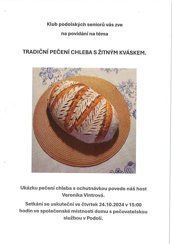 Klub podolských seniorů vás zve na povídání na téma TRADIČNÍ PEČENÍ CHLEBA S ŽITNÝM KVÁSKÉM.