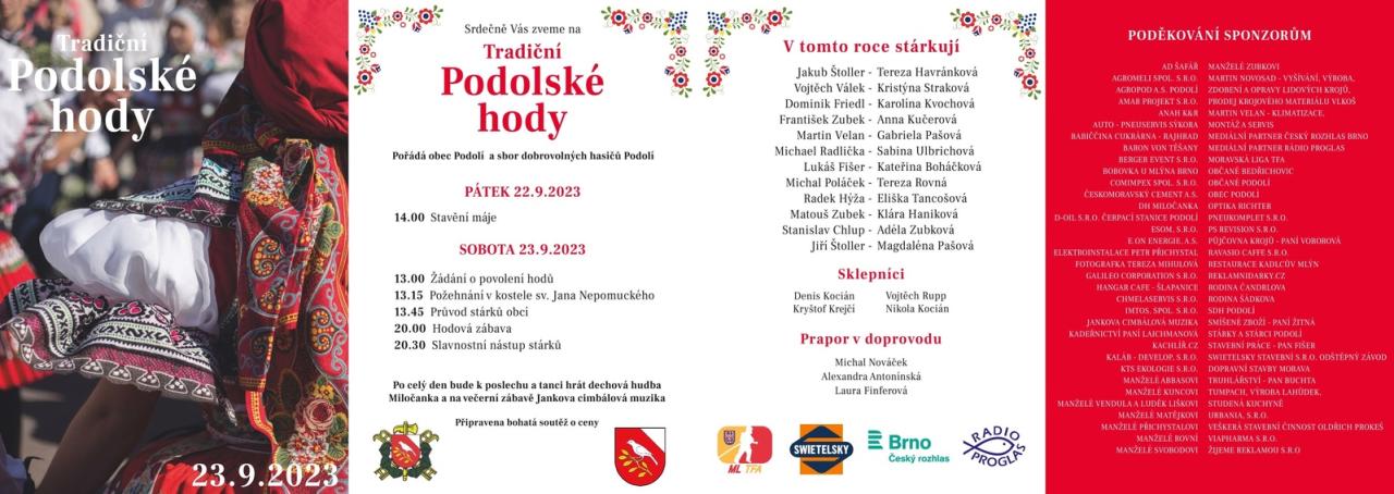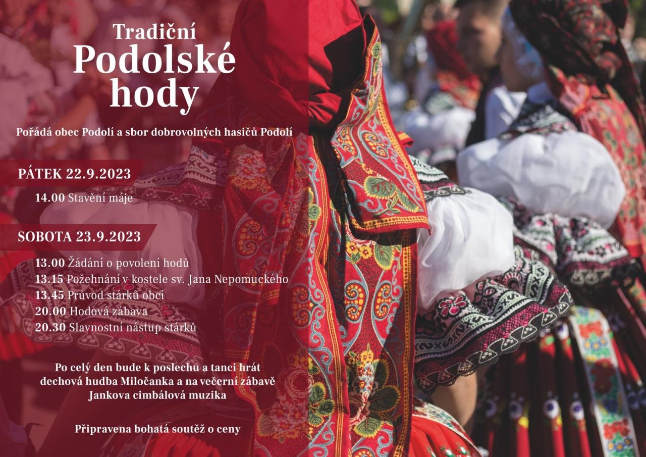 Podolští stárci, obec Podolí a sbor dobrovolných hasičů Podolí Vás srdečně zve na Tradiční Podolské hody, které se konají v sobotu 23. září.