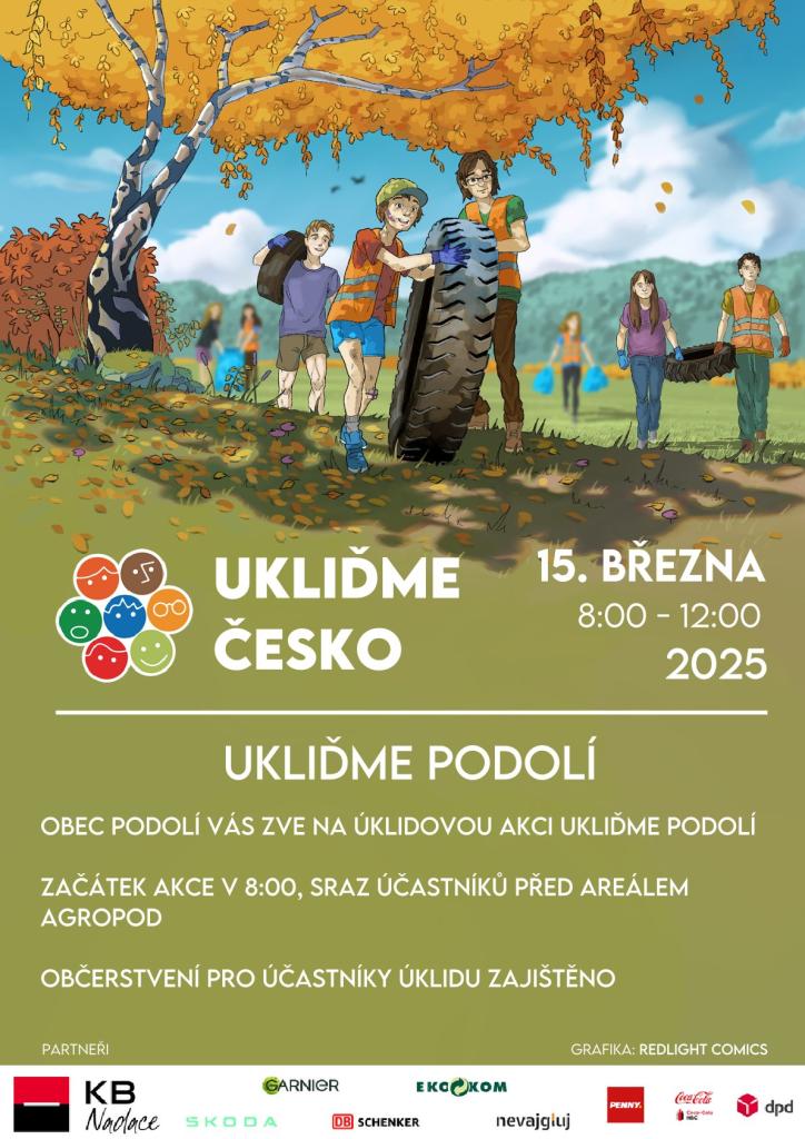 Obec Podolí zve všechny dobrovolníky k akci "UKLIĎME PODOLÍ A JEHO OKOLÍ", která se koná v sobotu 15. března. Sraz účastníků v 8:00 před areálem Agropod.