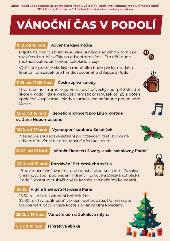 Obec Podolí ve spolupráci se Zpěváčkem Podolí, ZŠ a MŠ Podolí, Orel jednota Podolí, farnost Podolí, SDH Podolí, Podoláci a T.J. Sokol Podolí si vás dovolují pozvat na VÁNOČNÍ ČAS V PODOLÍ